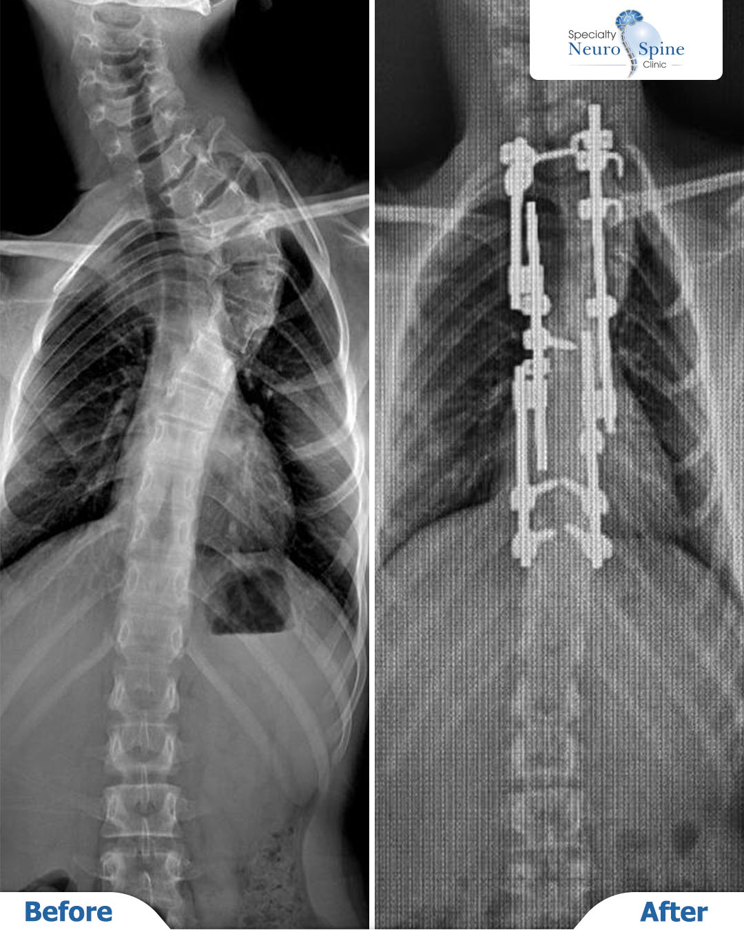 قبل وبعد صور الأشعة لمريضتنا الجميلة عالية، البالغة من العمر 15 عاماً من الأردن، أجرى لها الدكتور فراس الحسبان عملية تصحيح انحراف العمود الفقري وتثبيت الفقرات، من الفقرة الصدرية الأولى حتى الثانية عشرة.